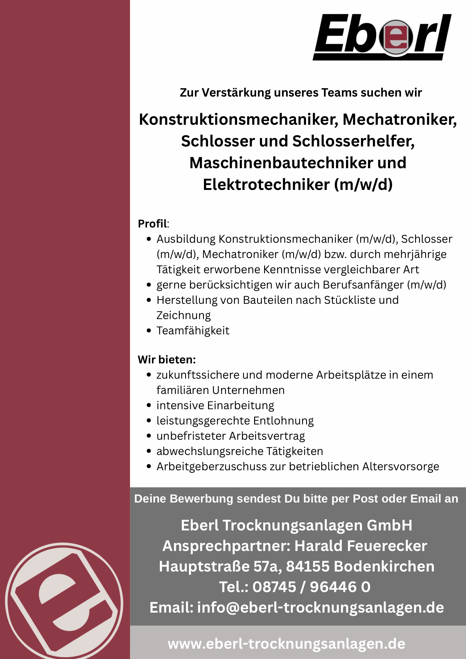 Konstruktionsmechaniker, Mechatroniker, Schlosser und Schosserhelfer, Maschinenbautechniker, Elektrotechniker (m/w/d)