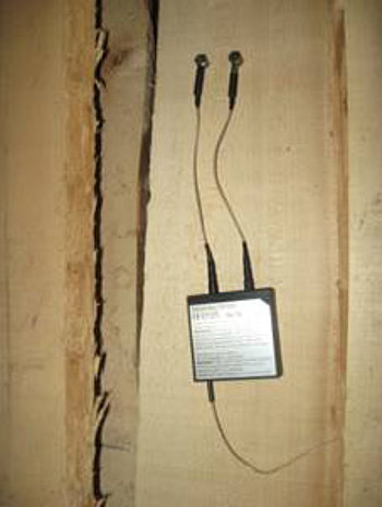 Bezkablowy pomiar wilgotności drewna eliminuje czasochłonne rozkładanie przewodów do łączenia czujek. Po podłączeniu nadajnika do elektrod dane są przekazywane drogą radiową do sterowania.